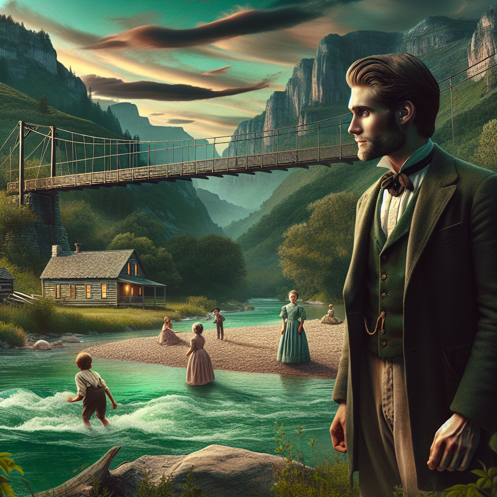 During the early moments of the night, a cab driver drops off a man named Richard at a suspended footbridge. As Richard pays the driver, the driver explains that the home he is looking for is across the river. After the driver leaves, Richard begins his journey and observes the surrounding nature. He examines the clouds above him and the lights of the home he is heading towards. The footbridge is over a large, green river and the swaying of the bridge frightens Richard. He runs quickly across the bridge and finds it humorous that he found such a bridge scary. As Richard arrives at the home, a woman named Gertrude greets him. She asks Richard if the footbridge frightened him and he explains that it did, but that he was able to outrun it. Gertrude relates the experience of going across the bridge to that of walking across a tightrope — a hobby she had when she was younger. Gretchen introduces Richard to the members of her family—her two younger sisters Anne and Mary and her father. The family joke about Richard's apprehension of the river and the bridge before heading inside. Gretchen's father explains that the river is very warm throughout all of the seasons, but that the family was watching out for Richard in case he made a wrong turn. Gretchen leads Richard upstairs and explains that there is a water pitcher for him to clean up and to meet her outside later. Richard bathes himself and heads outside after to see Gretchen and her father. Richard talks about how this is his first time in the mountains. Gretchen's father explains that he used to live on the coast in Norfolk so he understands the difference in environment. Her father continues to talk about the loss of his wife and cries thinking about it. Gretchen leans into Richard as her father cries and then departs for the night. Gretchen asks Richard why he came and if he has feelings for her. She becomes upset, explaining that she loves Richard and is confused why he does not love her. Richard tells Gretchen that he regrets coming and will be leaving as soon as he can in the morning. Gretchen asks him for a kiss, but he does not kiss her. Richard feels immense guilt as he retreats to his room for the night. Before he falls asleep, Richard goes to Gretchen's room, only to find her praying and sobbing. Richard realizes that he loves Gretchen and returns to his room to sleep. In the morning, Gretchen knocks on Richard's door to wake him up. He tells her that he is not going to be leaving that day and instead wants to stay in the mountains with her longer. Richard then asks Gretchen if he can go touch the river he walked over the previous day.